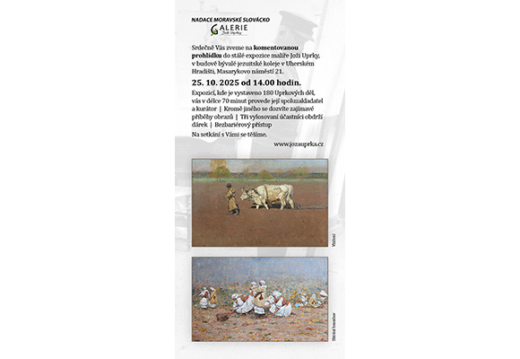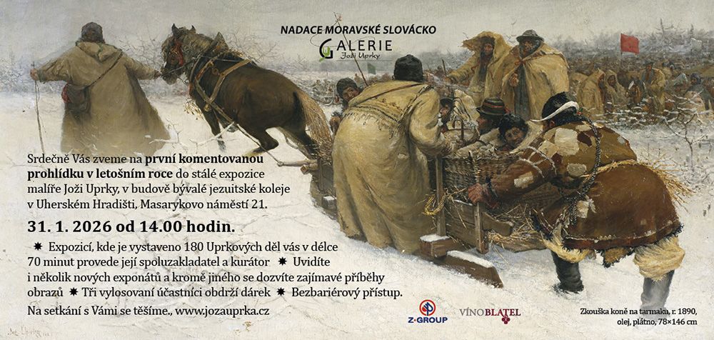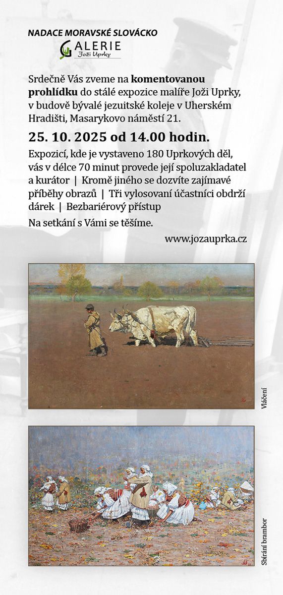 V Uherském Hradišti 12. 11. 2024 Vážená paní, pane, V případě, že plánujete zájezdy vašich klientů za poznáním a relaxací na Jižní Moravu, do Zlínského kraje či přímo na Slovácko, nabízíme vám návštěvu stálé expozice významného českého a moravského malíře Joži Uprky v revitalizovaných prostorách památkově chráněné barokní budovy bývalé jezuitské koleje v Uherském Hradišti. V expozici je na ploše 1200 m2 ve dvanácti výstavních sálech vystaveno 160 děl tohoto svébytného umělce, který spolu s Tomášem Baťou jsou považováni za největší osobnosti celého Zlínského kraje. Některé z vystavených obrazů patří mezi stěžejní díla české a evropské výtvarné scény 19. a 20. století. V kontextu s tím nabízíme zdarma netradiční komentované prohlídky, mimo jiné i o zajímavých příbězích vystavených obrazů za účasti kurátora expozice. Pro specializovaný zájezd milovníků historie a výtvarného umění je možné do programu na Slovácku zařadit i návštěvu galerie malířů Slovácka ve Veselí nad Moravou a další zajímavá místa spojená s Jožou Uprkou. Kraj Uprky je známý i dobrým vínem. Uprkovy oblíbené odrůdy vín je možné i ve velkých skupinách ochutnat včetně pohoštění ve vinařství Blatel a.s. v Blatnici pod sv. Antonínkem. Další informace vám rádi poskytneme jakoukoliv formou. Na Vaši návštěvu se těšíme. Management Galerie Joži Uprky |